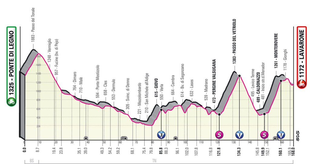 Stage 17 is rollers day! Picture a backdrop of beautiful Brescia and lines of riders spinning their legs before the start. This profile has become a signature of modern Grand Tour racing. There’s around 8km of climbing (uncategorised but not easy) from the moment the flag drops. There are then long sections of downhill road before two cat-1 climbs at the day’s conclusion. This could be a day we see ‘two races’. The breakaway will cut and run, and the GC boys will eventually wind themselves up ahead of the brutal 10% gradient Monterovere.