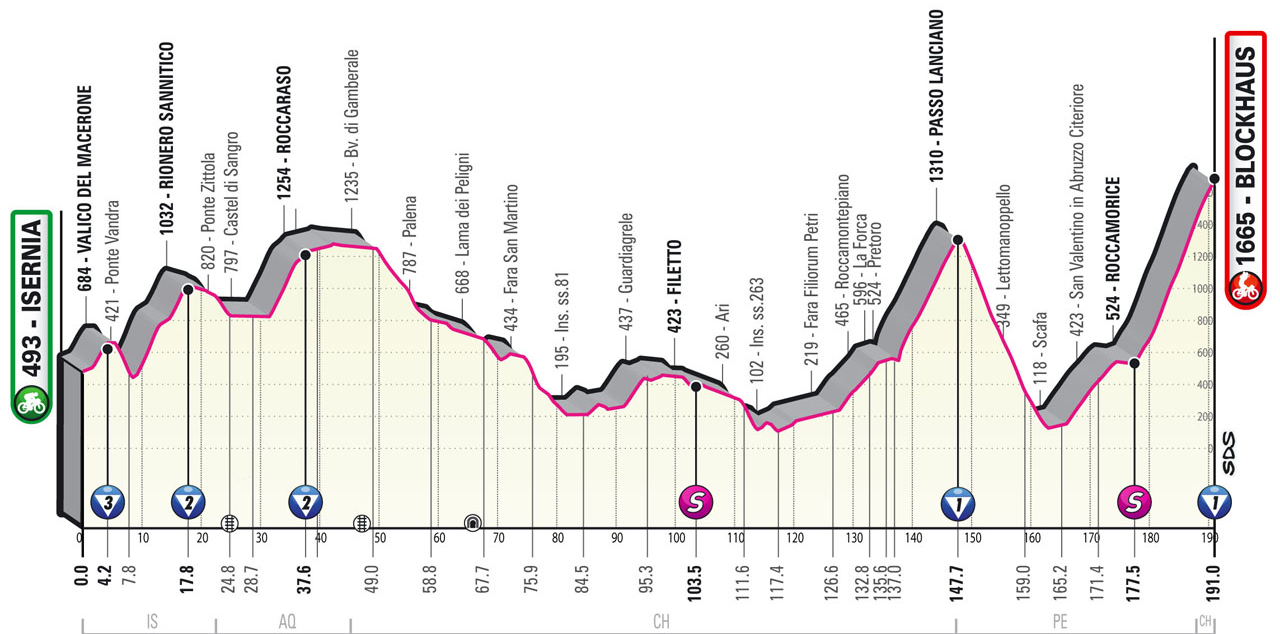 Stage 9 supplies a bumper day of climbing combining the Passo Lanciano (10.3km at 7.6%) and Blockhaus (13.6km at 8.4%) ascents. It’s a far harder day out than when we visited Blockhaus in 2017. It will either be a GC day or we’ll see a spectacular performance by a seriously talented breakaway rider.